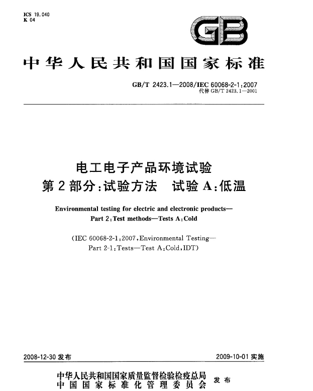 GB/T 2423.1-2008是中國國家標準,全稱為《電子和電氣產(chǎn)品環(huán)境試驗 第2部分:試驗方法 第1節(jié):冷熱試驗》。該標準主要針對電子和電氣產(chǎn)品在溫度變化環(huán)境下進行測試的方法和要求。